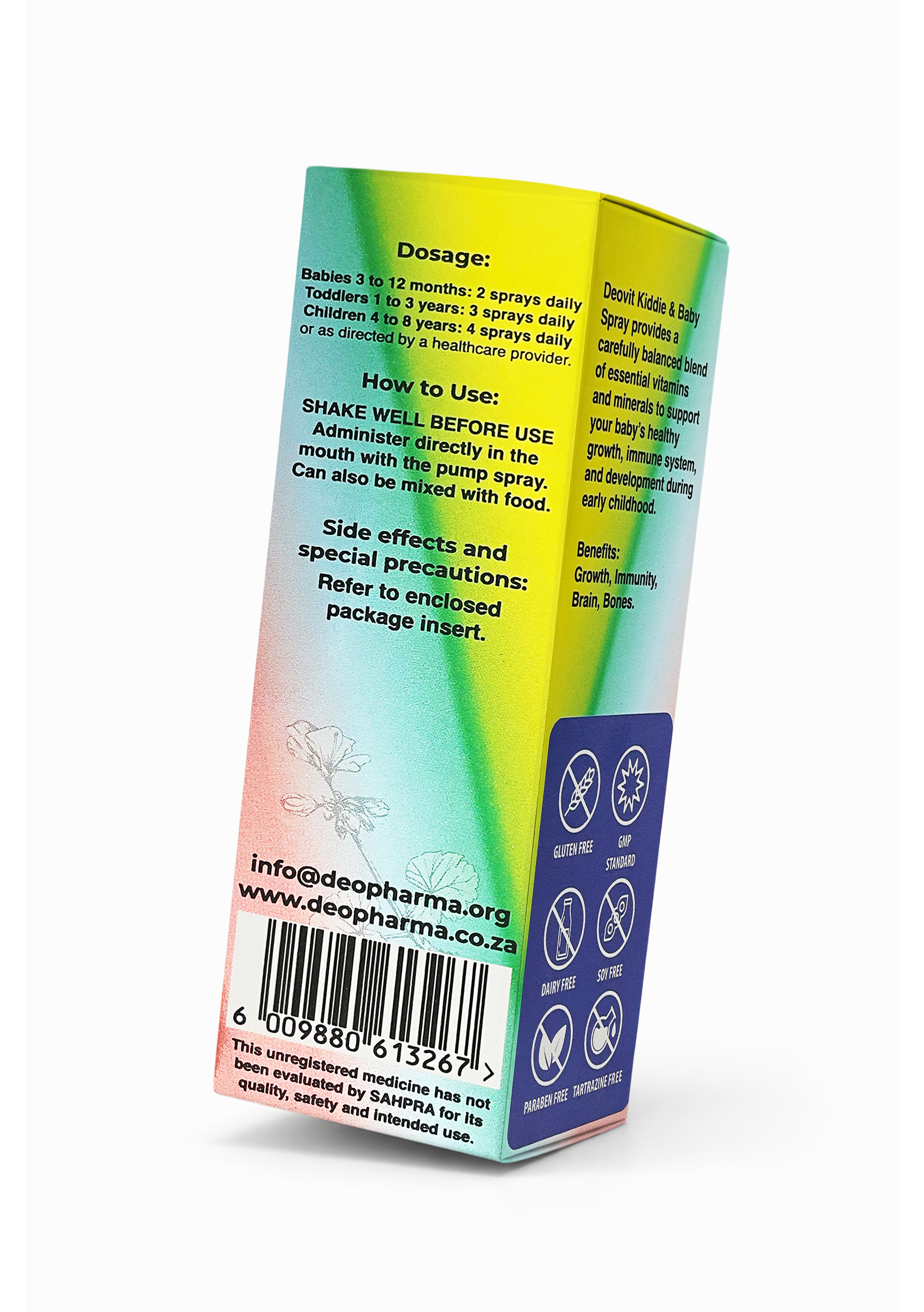 DEOVIT Kiddie & Baby Spray is formulated with essential vitamins, minerals, zinc, and iron to support healthy growth and development during early childhood. Suitable from 3 months old, it provides daily nutritional support in an easy-to-administer oral pump spray format. The formulation is designed to support growth, immunity, brain development, and bone health, and can be administered directly in the mouth or mixed with food.