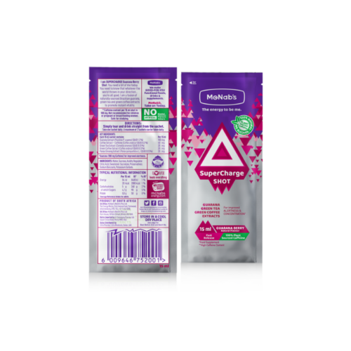 McNab’s SuperCharge Guarana Berry Energy Shot is a GOOD-FOR-YOU plant-based caffeine blend of natural ingredients and vitamins that delivers a healthy instant energy boost. Filled with nature’s best pick-me-ups, this product is easy to use and easy to carry. Just tear it open and enjoy the vibrant guarana berry taste.