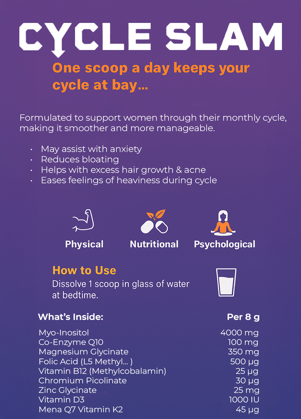 CycleSlam is a premium blend designed to support hormonal balance, metabolism, and overall wellness. With Myo-Inositol, Co-Q10, Magnesium, and essential vitamins and minerals, it helps regulate glucose, improve energy, and promote healthy ovulation.